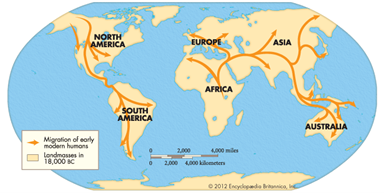 Mapa que contiene las migraciones de los pueblos desde que el ser humano salió de África. La sangre de Nuestra Madre contiene genes de cada uno de estos pueblos.